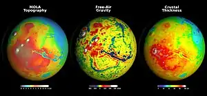 En general, la isostasia controlada por la topografía impulsa las anomalías gravitatorias del aire libre de longitud de onda corta.[2] Al mismo tiempo, el flujo convectivo y la fuerza finita del manto conducen a anomalías de gravedad en el aire libre de escala planetaria de longitud de onda larga en todo el planeta.[3][4] La variación en el espesor de la corteza, las actividades magmáticas y volcánicas, el levantamiento de Moho inducido por impactos, la variación estacional de los casquetes polares, la variación de la masa atmosférica y la variación de la porosidad de la corteza también podrían correlacionarse con las variaciones laterales.[5][6][7][8][9]