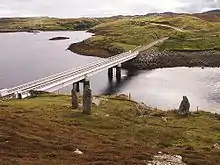 Tursachan, el monumento megalitico Callanish VIII y el puente que conecta con la isla de Lewis.