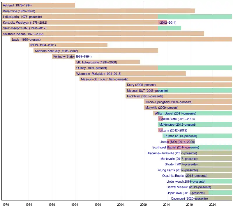 | Universidad de Misuri–San Luis | St. Louis, Missouri | 1963 | Pública | 16,471 | Tritons | 1995 |