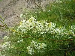 Es un arbusto postrado o erecto que es endémico de Perth, Australia. Alcanza los 2,5 metros de altura y tiene flores blancas o cremas que florecen en los finales del invierno o mediado de primavera.