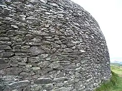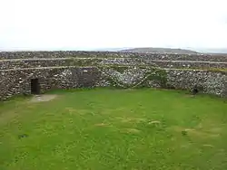 Las ruinas del propio cashel se describen como una pared circular que encierra una superficie de 23,6 metros (77 pies 6 pulgadas) de diámetro. La muralla tenía una altura de 1,8 metros (6 pies) con una anchura que varía de 4,6 metros (15 pies) a 3,5 metros (11 pies 6 pulgadas). Si bien no es perpendicular, tenía una inclinación hacia el interior que indica su similitud con la mayoría de los fuertes de piedra irlandeses. Petrie sugiere que probablemente originalmente era entre dos veces y cuatro veces de alto. Los 1,5 metros (5 pies) en el lado interior de la pared, con un espesor de 0,76 metros (2 pies 6 pulgadas) es debido a la presencia de terrazas. La terraza por la que se accede por tramos de escaleras a ambos lados de la puerta de entrada. Las piedras caídas habían cubierto cualquier otra escaleras existente. Petrie sugiere que hubo originalmente tres o cuatro de esas terrazas ascendentes a la parte superior de la pared. A cada lado de la puerta de entrada, hay "galerías" dentro de la pared. Su propósito exacto no está claro y no conectan con la entrada. Estos dos pasajes de pared, uno en el sur y otro desde el noreste corren hacia la puerta de entrada, pero no llegan. Cerca del extremo norte del paso sur hay un pequeño receso en su pared oeste. En el extremo sur del paso norte hay un asiento de piedra.