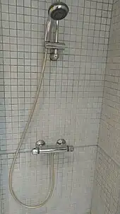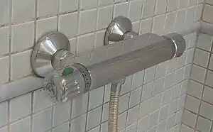 La temperatura del agua caliente se puede mantener constante, con un margen de error del sistema de control de aproximadamente un grado Celsius. Al igual que en el caso de los grifos de agua caliente sanitaria, los termostatos suelen estar equipados con un mecanismo de bloqueo en la palanca de funcionamiento, que debe desbloquearse para seleccionar temperaturas superiores a 38 °C. Algunos termostatos tienen un botón de ahorro de agua, que debe desbloquearse para obtener el máximo caudal posible.