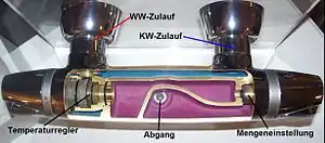 La pieza clave de un grifo termostático es el regulador alrededor del que fluye el agua mezclada. Consta de un alambre bimetálico enrollado en forma de resorte helicoidal, o bien de una cápsula llena de parafina, denominada elemento de expansión de cera. Ambos tipos de reguladores cambian de longitud de forma proporcional a los cambios de temperatura que experimentan. Las versiones que utilizan un cable bimetálico normalmente se pueden diseñar con cambios de longitud más amplios, lo que redunda en una mayor precisión en el control de la temperatura del agua.[2]