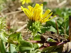 Esta es una hierba perenne erecta formando parches de pasto de 20 centímetros de alto a extensos soportes de erectos pedúnculos que alcanzan un tamaño de un metro de altura. La planta es generalmente de color verde, pero los tallos a menudo son de color rojo o púrpura-marrón y las hojas pueden ser un tanto amarillento a rojizo. Los tallos están cubiertos con cabezas de flores de 2 o 3 centímetros de ancho con copas hemisféricas de verdosos filarios que son como una garra y doblan lejos de las flores. El centro de la cabeza está llena de pequeños floretes del disco de color amarillo y la circunferencia se alinea con los floretes de rayo de oro. La cabeza produce un exudado blanco grueso, especialmente en las nuevas cabezas de las flores.