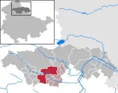 Se encuentra ubicado a poca distancia al sur de la frontera con el estado de Sajonia-Anhalt.