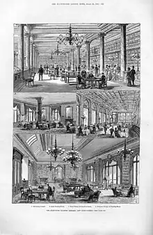 La biblioteca de la Grosvenor Gallery, publicada en The Illustrated London News, el 26 de marzo de 1881."1. Circulating Library 2. Large Reading-Room 3. Large Dining and Luncheon Room 4. Reference Library and Reading-Room"