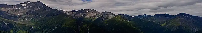El grupo Lasörling visto desde el refugio de Eissee y el valle de Timmeltal (en el eje del valle está el Berger Kogel )