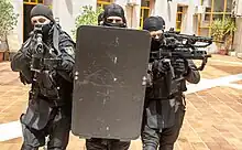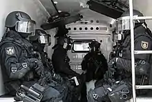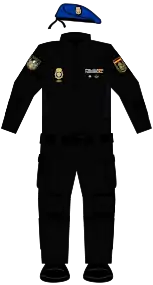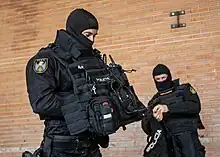 El uniforme básico de los agentes GOES se compone de un chaleco y casco antibalas y un subfusil MP5 con linterna acoplada.