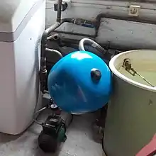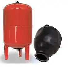 - Depósito hidroneumático con membrana: Estos acumuladores se llenan con una carga fija de aire.[14] Cuando la bomba funciona, entra agua en la vejiga situada en el interior del depósito, provocando una compresión del volumen inicial de aire cargado en el mismo y por consiguiente un aumento de la presión en su interior. La energía almacenada en el aire del acumulador hidroneumático impulsa al agua contenida en el interior de la vejiga hacia los puntos de consumo. A medida que esta se vacía, la presión del aire o nitrógeno disminuirá, alcanzado la presión mínima establecida, que será captada por el presostato, que restablecerá nuevamente la corriente de alimentación de agua desde el grupo de bombeo hacia el acumulador hidroneumático.