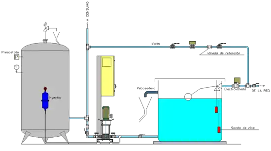- Alimentación indirecta, mediante depósitos auxiliares de tipo atmosférico, es decir, abiertos a la atmósfera, en cuyo caso deberán disponer de un rebosadero,[20] un sistema de llenado mediante una electrovávula en la tubería de entrada,[21] mandada por interruptor de nivel que la abre y la cierra entre dos niveles mínimo y máximo respectivamente. El tubo de llenado del depósito, debe quedar, al menos, 15 cm por encima del rebosadero. También mediante interruptor de nivel, se cortará la corriente a las bombas, cuando el nivel del depósito baje del límite inferior y antes de que alcance las cercanías del orificio de salida, con el fin de evitar que trabajen en seco, en caso de falta de agua en la red general.