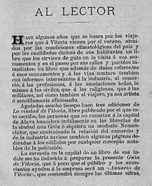 Para su elaboración, asegura Colá y Goiti que se sirvió de itinerarios, nomenclátores y guías hechas por autóctonos y extranjeros, sobre todo francesas, alemanas e inglesas.[9] «Mi aspiración para el porvenir es dotar á nuestra ciudad querida, en la cual vimos la luz primera, de un verdadero y copioso anuario del comercio, de la industria, de la agricultura, de las ciencias y de las artes, de las profesiones todas, en una palabra, como lo tienen otras poblaciones menos importantes y menos cultas que la capital alavesa», zanja.[10]