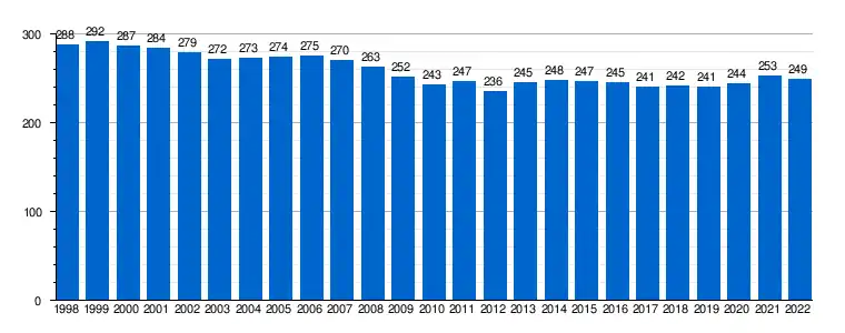 | Gráfica de evolución demográfica de Guadalaviar[6] entre 1998 y 2022 |