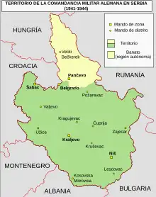 Tras la invasión, ocupación y desmantelamiento de Yugoslavia por parte de las potencias del Eje en abril de 1941, la Wehrmacht estableció el Territorio del comandante militar en Serbia[nota 1] bajo el mando de un gobierno militar de ocupación. Dentro de los límites del territorio, se encontraban la mayoría de la propia Serbia, la parte norte de Kosovo —alrededor de Kosovska Mitrovica— y el Banato.[4] Fue la única área del dividido Reino de Yugoslavia en la que los alemanes establecieron un gobierno militar, con el fin de explotar las importantes rutas ferroviarias y fluviales que la atravesaban, así como sus valiosos recursos, particularmente los metales no ferrosos.[5] El comandante militar en Serbia encomendó al Gobierno títere serbio la tarea de «proseguir con las labores administrativas bajo la supervisión y dirección alemanas».[6] El 29 de agosto de 1941, los alemanes crearon el Gobierno de Salvación Nacional de Serbia (serbocroata: Vlada Nacionalnog Spasa, Влада Националног Спаса), presidido por el general Milan Nedić, con el fin de reemplazar a la efímera Administración de Comisarios.[7]