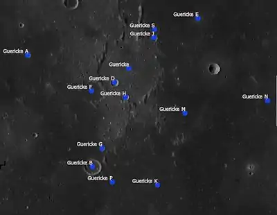 Por convención estos elementos son identificados en los mapas lunares poniendo la letra en el lado del punto medio del cráter que está más cerca de Guericke.