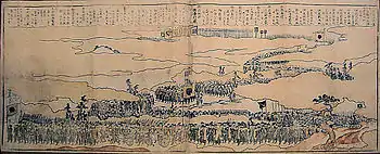 Tras su coronación, el Emperador Meiji publicó su Carta de juramento, pidiendo la creación de asambleas deliberativas, prometiendo mejores oportunidades para la gente corriente, aboliendo la "malas costumbres del pasado" y buscando conocimiento por todo el mundo "para reforzar los cimientos del gobierno imperial". Entre las notables reformas del gobierno Meiji se cuenta la abolición del sistema feudal, por la que los dominios feudales y sus señores hereditarios fueron reemplazados respectivamente por prefecturas y gobernadores nombrados por el emperador.[59] Entre las otras reformas destacan la introducción de la enseñanza obligatoria o la abolición de las clases sociales confucianas. Las reformas culminaron en 1889 con la proclamación de la Constitución Meiji. Sin embargo, a pesar del apoyo que los samuráis daban a la corte imperial, muchas de las reformas Meiji las consideraron perjudiciales para sus intereses: la creación de un ejército de reclutas compuesto por plebeyos, así como la pérdida del prestigio hereditario y los estipendios contrariaron a muchos antiguos samuráis.[60] La tensión fue particularmente alta en el sur, y culminó en las rebeliones de Saga en 1874, y la de Chōshū en 1876. Los antiguos samuráis de Satsuma, dirigidos por Saigō Takamori, que había dejado el gobierno por diferencias respecto a la política exterior, comenzaron la Rebelión Satsuma en 1877. Combatieron en nombre del mantenimiento de la clase samurái y de un gobierno más virtuoso. Su lema era «nuevo gobierno, gran moralidad» (新政厚徳 shinsei kōtoku?). La rebelión terminó en una derrota total para los samurái en la batalla de Shiroyama.[61] Saigō se proclamó leal al Emperador Meiji y llevó su uniforme del ejército imperial durante el conflicto. Se suicidó antes de la carga final y fue posteriormente perdonado póstumamente por el emperador.[62]