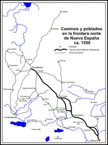 Nota: en el mapa adjunto se señala la ubicación de la villa de Santiago del Saltillo, pero esta población no existía hacia el año de 1550, sino que fue fundada hasta por el año de 1570, pero la presencia de españoles en esa región se puede estimar que fue como desde el año de 1560, cuya presencia era temporal y tenía dos propósitos: tratar de localizar vetas de plata o placeres de oro, así como capturar indígenas nómadas para esclavizarlos para venderlos a los dueños de las minas de Zacatecas, Durango y Guanajuato. Es necesaria esta aclaración...