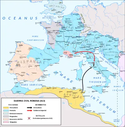 | Conflicto | lucha de Heracliano contra Flavio Constancio por el control del gobierno de Honorio | |||