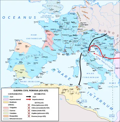 La primera medida militar que tomó el nuevo gobierno fue organizar un ejército con las tropas de Italia y enviarlo a África en primavera de 424 para acabar con Bonifacio y controlar la diócesis, vital para mantener el apoyo popular.[7] El comes Africae, sin embargo, esperaba este ataque desde que falleciese Honorio y había hecho fortificar Cartago y las principales ciudades.[8] Aunque contaba con un ejército relativamente pequeño fue capaz de resistir y acabar con los atacantes.[9] Esta victoria tuvo, además, otra consecuencia: animados por el éxito de Bonifacio, seguidores de la dinastía teodosiana asesinaron en Arlés al prefecto del pretorio de las Galias y a los principales oficiales del ejército con lo que Juan perdió también el control de esa prefectura.[9] En esta situación y ante la falta de las tropas italianas y de la Galia, el gobierno occidental encargó a Aecio dirigirse al territorio de los hunos con el objetivo de reclutar un gran contingente de mercenarios.[10]