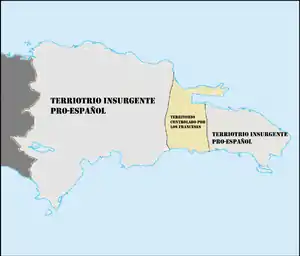 ![]() Situación de Santo Domingo durante la ocupación francesa, en mostaza la zona controlada por los franceses y en gris la zona insurgente que reclamaban la soberanía española en la isla. | ||||