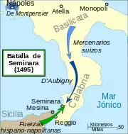 El 24 de mayo de 1495 Gonzalo de Córdoba llegó a Mesina y dos días después cruzó el estrecho, desembarcando en Calabria con dos mil infantes y trescientos jinetes ligeros. Estableció su cuartel general en la fortaleza de Reggio y mandó ocupar con pequeñas guarniciones las plazas cedidas por Ferrandino al Rey Católico. El militar español tendría enfrente al escocés Bérault Stuart, señor de Aubigny, designado por Montpensier para ocupar la Calabria, y que contaba con mayor número de soldados.
