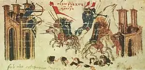 ![]() Miniatura de la Crónica de Manasés en la que aparece el emperador Heraclio asaltando una fortaleza persa mientras que ávaros y persas asedian Constantinopla en el 626. | ||||