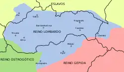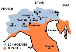 Las guerras bizantino-lombardas o guerras romano-lombardas fueron una prolongada serie de conflictos ocurridos entre 568 y 751 al norte de la península itálica, enfrentado al Imperio Romano de Oriente y al Reino Lombardo. Éstas comenzaron con la invasión de la llanura Padana por el rey lombardo Alboino, con el interés de expulsar la reminiscencia imperial romana.[3] Finalizaron con la derrota de los romano-orientales, ya que los lombardos pudieron asegurar su dominio sobre el norte italiano y progresivamente conquistar todo el exarcado de Ravena, haciendo que Constantinopla renuncié a sus intereses de resucitar a la Italia romana.[4]