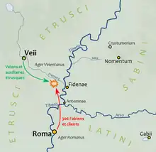 Ese mismo año la gens Fabia se dirigió al Senado proponiendo que solo ellos gestionaran las cuestiones militares y financieras de la guerra contra Veyes. El Senado se mostró de acuerdo, con agradecimiento, y el gentío exclamó el nombre de los Fabia. Al día siguiente, los Fabia se armaron y 306 hombres, incluyendo el cónsul, marcharon a través de Roma y salieron por la puerta Carmentalia. Se dirigieron al norte y establecieron su campamento junto al río Crémera y lo fortificaron.[26]