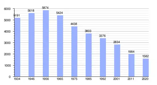 | Gráfica de evolución demográfica de Guiguén entre 1934 y 2020 |