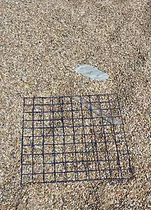Medición del tamaño del guijarro en la Chesil Beach Inglaterra.
