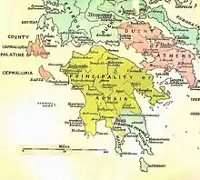 Como los francos no pudieron conquistar todos los territorios bizantinos, dos estados sucesores, Epiro y Nicea, surgieron en las fronteras occidental y oriental del caído imperio, respectivamente.[10] Los griegos de Epiro iniciaron la reconquista de los antiguos territorios bizantinos en Tesalia en la década de 1210.[11] Aniquilaron el Reino de Tesalónica y capturaron su ciudad capital en diciembre de 1224.[12] Su expansión hacia Constantinopla terminó abruptamente cuando sufrieron una derrota masiva a manos de los búlgaros en la batalla de Klokotnitsa en 1230.[13] Los griegos de Nicea lanzaron invasiones contra el Imperio latino desde el este. En 1235, reconquistaron Anatolia y se apoderaron de una cabeza de puente europea en Galípoli.[14] En teoría, los príncipes de Acaya todavía debían lealtad a los emperadores latinos, pero en la práctica, el emperador Balduino II no habría podido defender Constantinopla sin el apoyo militar y financiero de los aqueos.[15] A cambio, reconoció al hijo mayor y sucesor de Godofredo, Godofredo II, como el señor supremo de los triarcas de la isla de Negroponte y posiblemente de otras islas del Egeo.[16]