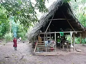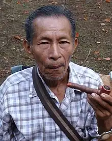 ![]() Guillermo Ojanama Chujundama, maestro vegetalista especialidado en uspawasha sanango, con su pipa en su chacrkra cerca de Chazuta. | ||