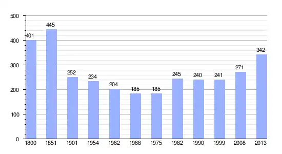 Los datos demográficos contemplados en este gráfico de la comuna de Guilmécourt[4] se han cogido de 1800 a 1999 de la página francesa EHESS/Cassini, y los demás datos de la página del INSEE.[5]