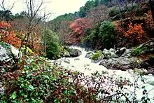 En el piso inmediatamente superior, el supramediterráneo —en el que se enclava la localidad y que en la zona está relacionado con una precipitación y humedad ambiental muy elevada— la especie dominante actualmente es el Pinus pinaster, fruto de las repoblaciones llevadas a cabo durante el siglo XIX con objeto de reforestar la zona.[nota 3] Llegaría hasta los 1600 m s. n. m.[30] Encima de este se encuentra el piso oromediterráneo, caracterizado por el piornal y ejemplares dispersos de Pinus sylvestris. Por encima de los 2200 m s. n. m. se encuentra el piso criomediterráneo, con temperaturas medias anuales por debajo de los 4 °C; en este se prodigan el cervunal y los líquenes y musgos de montaña.[30]