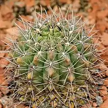 Presenta un tallo esférico que se alarga hasta alcanzar los 60 cm y 15 cm de diámetro, verdoso apagado o amarronado, ocasionalmente emite vástagos basales. Tiene 12 a 20 costillas con tubérculos muy salientes provistos de un rostro muy pronunciado y profundos canales transversales entre ellos. Las aréolas, algo hundidas, son grises y presentan de 7-10 espinas radiales, dirigidas hacia fuera y algo curvadas, de color pardo pálido y con la base rojiza; las espinas centrales en número de 1-3 , son del mismo color y pueden alcanzar los 3 cm