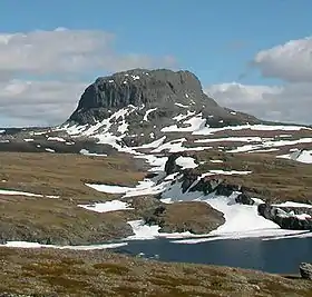 El pico de Hårteigen se eleva 480 metros sobre la llanura circundante (1.690 m sobre el nivel del mar).