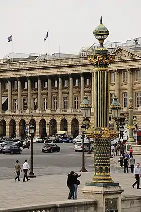 En 1758, el rey de Francia, Luis XV, encargó a su arquitecto, Jacques-Ange Gabriel, que construyera dos fachadas idénticas a ambos lados de la rue Royale en la "Place Louis XV". : la fachada este que fue ocupada por el Hôtel de la Marine, mientras que el primer Hôtel de la Monnaie tomaría posesión de la fachada occidental. Pero esta ubicación finalmente se consideró demasiado alejada del distrito comercial y una decisión del Consejo decidió que el nuevo edificio se levantaría en su ubicación actual, en el Quai de Conti. El terreno detrás de la columnata occidental se dividió entonces en cuatro lotes que fueron cedidos a particulares, con la condición de que levantaran mansiones privadas detrás de la fachada de Gabriel:
