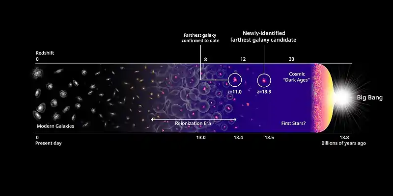 La anterior galaxia más lejana conocida, GN-z11, descubierta en 2015, tenía un corrimiento al rojo de 11, lo que sugiere que la posición observada de la galaxia es de unos 420 millones de años después del Big Bang.[8]