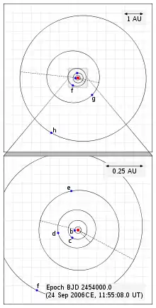 (días)Excentricidad b >1.35 ± 0.23 0.02225 ± 0.00035 1.1777 ± 0.0001 0.0000 ± 0.0025 c >13.1 ± 0.5 0.0641 ± 0.0010 5.7598 ± 0.0006 0.045 ± 0.026 i (no confirmado) >1.9 ± 1.8 0.0904 ± 0.047 9.655 ± 0.072 0.05 ± 0.23 d >11.8 ± 0.6 0.1286 ± 0.0020 16.358 ± 0.004 0.088 ± 0.041 e >25.1 ± 1.2 0.270 ± 0.004 49.74 ± 0.02 0.026 ± 0.036 j (no confirmado) >5.1 ± 3.2 0.330 ± 0.016 67.55 ± 1.28 0.07 ± 0.12 f >23.9 ± 1.4 0.493 ± 0.008 122.8 ± 0.2 0.135 ± 0.046 g >21.4 ± 3.4 1.422 ± 0.026 601 ± 8 0.19 ± 0.14 h >64.4 ± 4.6 3.40 ± 0.11 2220 ± 90 0.080 ± 0.070