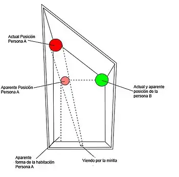 Como resultado de una ilusión óptica, una persona de pie en una esquina aparenta en la observación ser un gigante, mientras que una persona de pie en la otra esquina parece ser un enano. La ilusión es bastante convincente, pues una persona caminando hacia adelante y hacia atrás desde la esquina izquierda a la derecha parece que aumenta o disminuye.