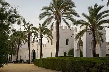 En las fachadas exteriores se abren una serie de vanos de diferentes dimensiones (puertas y ventanas) formados por arcos polilobulados enmarcados por alfices. Los muros de las fachadas están rematados por merlones.
