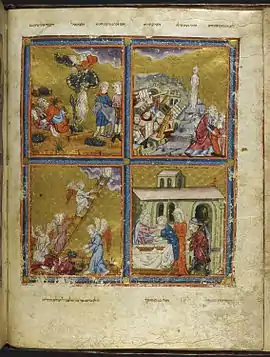 Las miniaturas que en la Hagadá presentan fondos dorados constituyen un verdadero ciclo narrativo y, como secuencia, también ellas fueron concebidas para ser leídas de derecha a izquierda y desde arriba hacia abajo. Los paneles en miniatura presentan episodios de los libros bíblicos del Génesis (27 paneles) y el Éxodo (26 paneles), así como también tres paneles con escenas que conciernen a tradiciones israelitas,[15] si bien la última de ellas, involucrando el abatimiento de corderos, hace referencia a una costumbre ya no practicada desde la destrucción del Templo.[17]