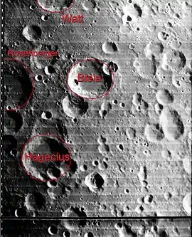Al noreste del cráter Hagecius aparece Biela, una formación más reciente de aspecto particular.