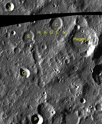 Hagen es un cráter de impacto situado en el lado oculto de la Luna, al norte de la gran llanura amurallada del cráter Planck, y al sur-suroeste del cráter Pauli.