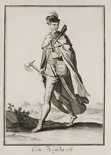 La palabra hajduk fue inicialmente un término coloquial para un estilo de soldado de infantería, de inspiración húngara o turco-balcánica, que formó la estructura fundamental del brazo de infantería polaco desde la década de 1570 hasta aproximadamente la década de 1630.[11] Inusualmente para este período, los hajduks polaco-lituanos vestían uniformes, típicamente de tela de lana gris azulada, con cuello y puños rojos. Su principal arma era un arma de fuego de llave de mecha de pequeño calibre, conocida como arcabuz. Para el combate cuerpo a cuerpo también llevaban una variedad pesada del sable, capaz de cortar las cabezas de picas y armas de asta enemigas. Contrariamente a la opinión popular, la pequeña hacha que a menudo llevaban metida en el cinturón (que no debe confundirse con la enorme hacha bardiche en forma de media luna, que rara vez llevaban los hajduks) no era un arma de combate, sino que estaba destinada a cortar madera.