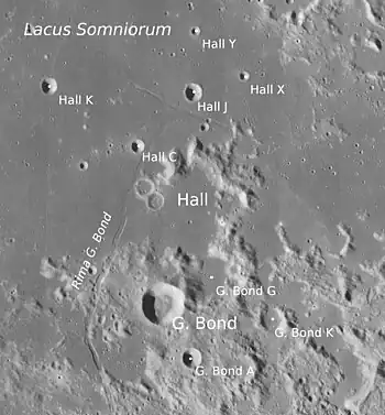 Atravesando el sector desaparecido del cráter se halla la grieta denominada Rima G. Bond (que toma su nombre del cercano cráter), una amplia hendidura en la superficie del mare. Tiene su inicio al norte de Hall con rumbo sur-sudoeste, inclinándose gradualmente de nuevo al sur-sureste. Pasa a través de una sección de terreno elevado a lo largo del borde meridional del mare, y mediante esta subida se une al borde meridional de Hall y rodea a G. Bond.