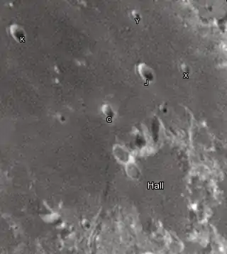 Por convención estas características se identifican en los mapas lunares colocando la letra en el lado del punto medio del cráter que es el más cercano a Hall.