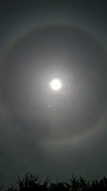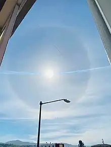 Un halo[1] es el efecto óptico en forma de disco alrededor del Sol o la Luna y que presenta un anillo iridiscente en su circunferencia exterior. Usualmente se ve en lugares fríos como Antártida, Alaska, Groenlandia, norte de Escandinavia, zonas boreales de Rusia, Canadá y Reino Unido, aunque también ha sido visible en países con clima tropical como Bolivia , Paraguay,[2] Argentina, Venezuela, Guatemala, Colombia, Ecuador, Costa Rica, República Dominicana, Perú, Panamá, México,España y otros. Puede ocurrir en cualquier lugar, si se dan las condiciones atmosféricas adecuadas, como por ejemplo fuera de las áreas polares, en zonas donde se estén desarrollando tormentas o haya mal tiempo, o en zonas templadas cuando el aire atmosférico posea ligeras nubes cristalizadas por el frío (casi siempre nubes del tipo cirrostratus). El halo es causado por partículas de hielo en suspensión en la troposfera que refractan la luz generando un espectro de colores alrededor de la Luna o el Sol.