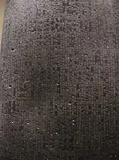 ![]() Remate superior de la estela con el Código de Hammurabi. Hammurabi (de pie) es representado en el momento que recibe sus insignias reales de manos de Šamaš, dios del sol y la justicia. El emperador babilonio tiene una mano sobre su boca en señal de oración.[1] | ||