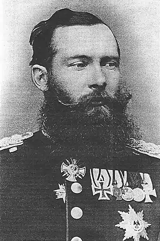 Como muchos miembros de su familia, fue educado en una escuela militar prusiana, de la que salió como teniente de húsares. Combatió en la guerra austro-prusiana, alcanzando el grado de coronel.