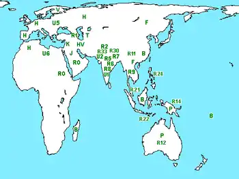 - U: A veces denominado UK o Uk por la inclusión del clado K. Es característico de toda Eurasia Occidental, común en Europa, Medio Oriente, Siberia Occidental, Subcontinente Indio y África del Norte. Pequeñas frecuencias en Oriente.
